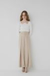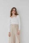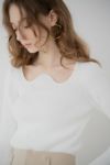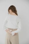 変形ネックデザインがお洒落なアクセントとなり、首元の開きがお顔まわりをすっきりと見せ、ゆるやかなカーブがデコルテを美しく引き立てます。