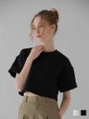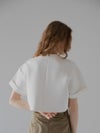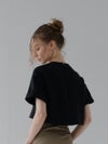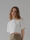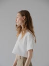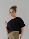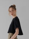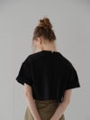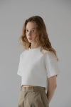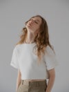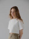 ふんわりとした膨らみと程よいボリューム感のある、ストレッチ性に優れたダンボール素材を使用しているショート丈Tシャツ。