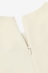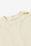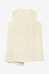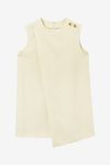 アシンメトリーなデザインが洗練された印象を与え、肩のきらめくボタンが上品なアクセントに。