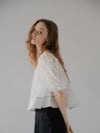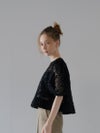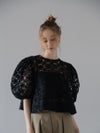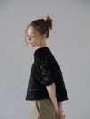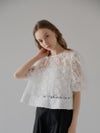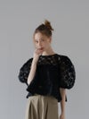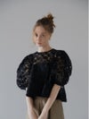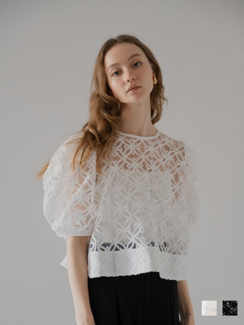 立体感のある花柄コード刺繍が目を引く、透け感のあるレーストップス。
