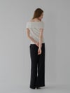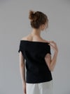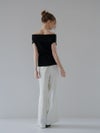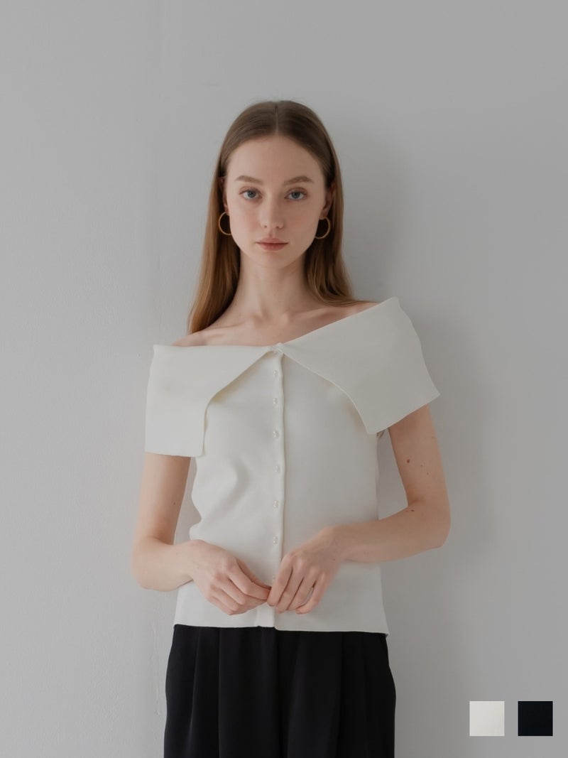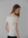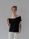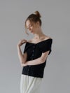 センターにあしらったパールボタンが印象的な、エレガントなオフショルボタンニット。