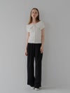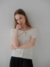 フェイクパールをあしらい、あえてボタンホールを設けないことで、フロントをすっきりと美しく仕上げました。