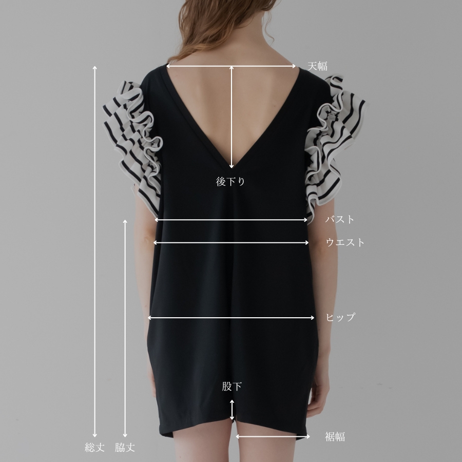 袖にあしらったフリルは、二の腕まわりをやさしく包み込み、さりげなく体型をカバー。