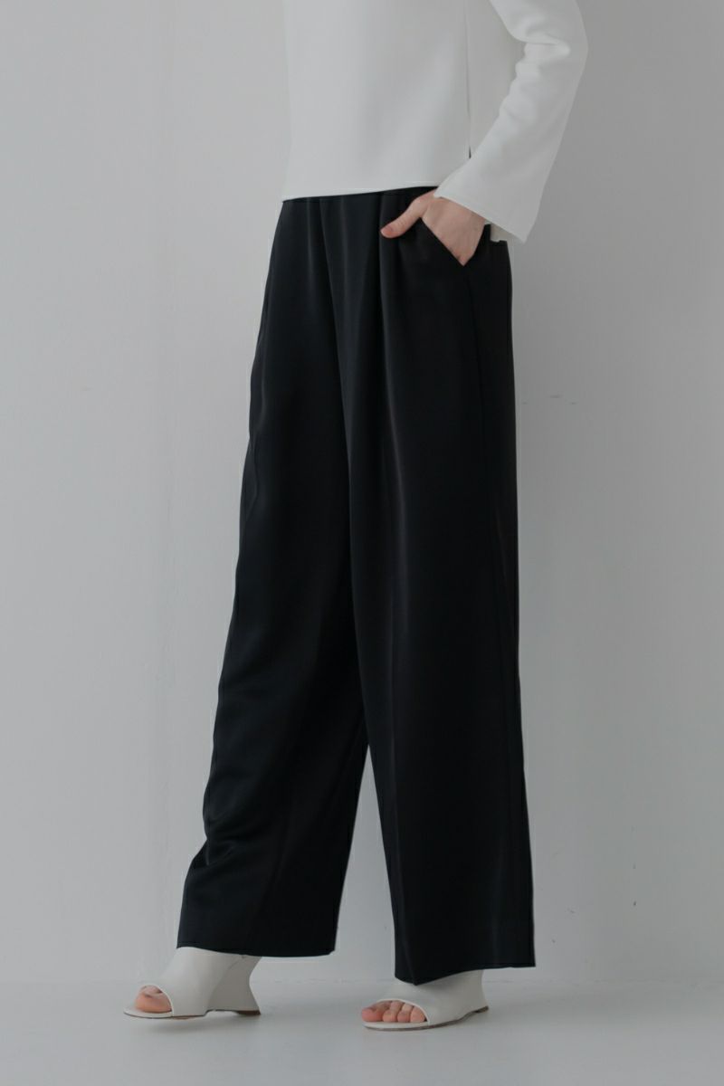 ウエストゴム仕様でリラックス感がありながらも、サテンの美しい光沢がきれいめな印象を演出します。