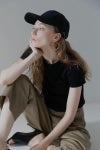 広めのツバと深さのあるシルエットが顔まわりをすっきりと見せ、自然な小顔効果を演出。