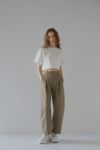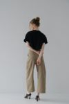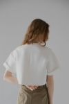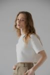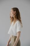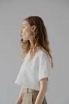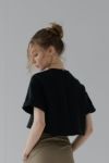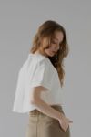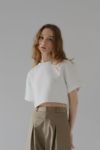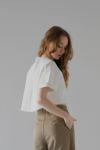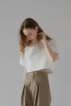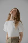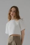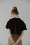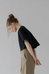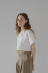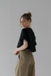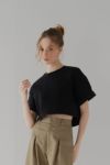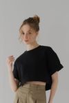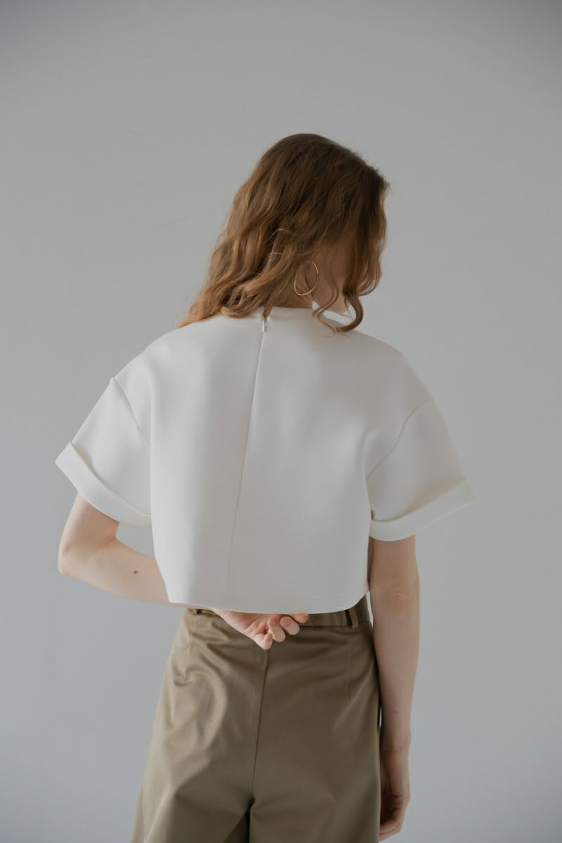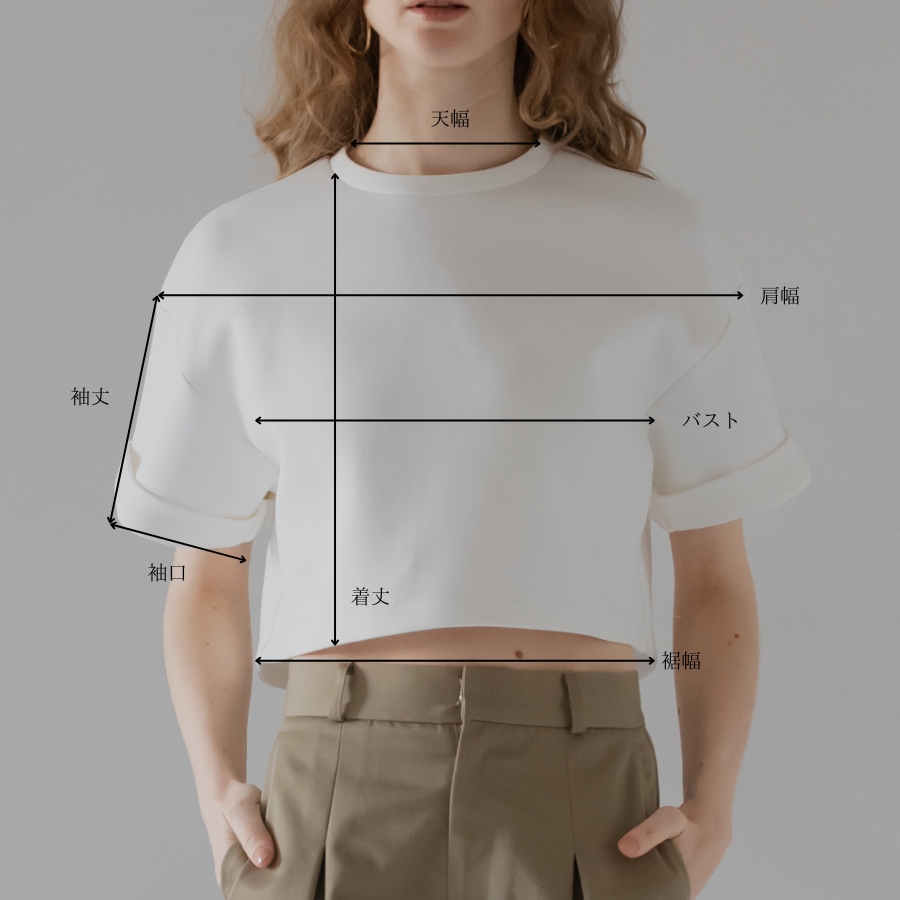 ふんわりとした膨らみと程よいボリューム感のある、ストレッチ性に優れたダンボール素材を使用しているショート丈Tシャツ。