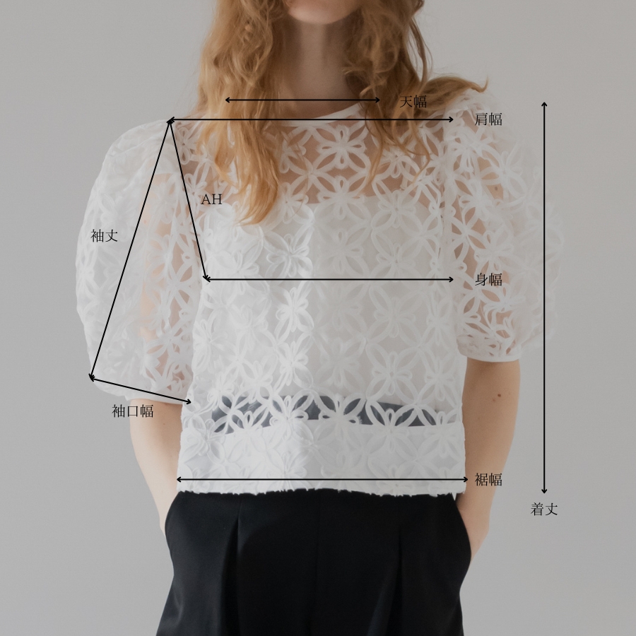 立体感のある花柄コード刺繍が印象的な、透け感のあるレーストップス。