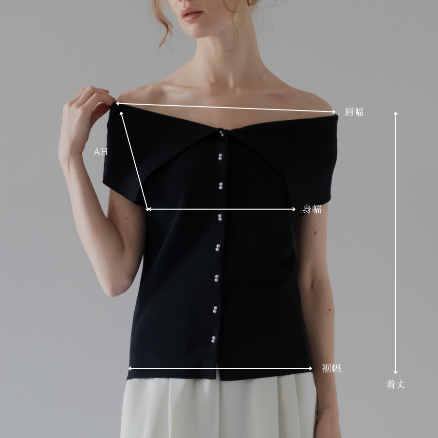 センターにあしらったパールボタンが目を惹く、上品なオフショルニット。